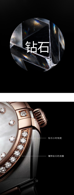 鉆石源自天地自然,晶瑩華美。歐米茄只甄選凈度從無瑕到VVS級別的“Top Wesselton”白色鉆石,經(jīng)高水準的專業(yè)切割工藝和精妙設計,或鑲于表圈,或嵌在表盤,以璀璨光芒詮釋永恒之美。