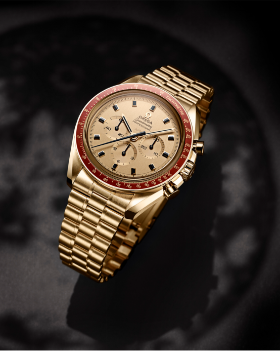 在1969這個重要年份里,除了隨宇航員登上月球的款式之外,還有一枚非常特殊的超霸表。在當(dāng)年慶祝登月成功的晚宴上,歐米茄捧出了一款黃色18K金限量超霸腕表:金色表盤,勃艮第紅色鋁制表圈,鍍黑指針與時標,這是第一枚貴金屬超霸。