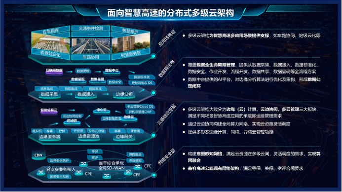 方案采用了分布式多級(jí)云架構(gòu),架構(gòu)大致分為邊緣(云)計(jì)算、云邊協(xié)同、多云管理三大板塊,通過(guò)云邊協(xié)同構(gòu)建全局算力網(wǎng)絡(luò),實(shí)現(xiàn)云資源靈活調(diào)度,提供多形態(tài)邊緣計(jì)算,同構(gòu)、異構(gòu)云管理功能,為智慧高速多應(yīng)用場(chǎng)景提供支撐。