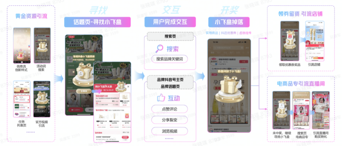 春日營(yíng)銷期間,“小飛盒”的驚喜禮遇玩法非常應(yīng)景。作為巨量引擎首個(gè)引導(dǎo)用戶搜索行為的彩蛋互動(dòng)產(chǎn)品,小飛盒能夠確定性提升品牌搜索量,加速用戶關(guān)系流轉(zhuǎn)。當(dāng)用戶在搜索、話題、信息流等場(chǎng)域觸發(fā)小飛盒后,搭配春意、愛意氛圍的禮盒就會(huì)“從天而降。利用獎(jiǎng)品派發(fā)的方式,激勵(lì)用戶去搜索品牌關(guān)鍵詞。通過這種互動(dòng)方式,小飛盒可以快速把興趣用戶轉(zhuǎn)化為種草用戶,再結(jié)合搜索品專、抖店優(yōu)惠券,引導(dǎo)用戶完成消費(fèi)轉(zhuǎn)化,高效串聯(lián)種收全鏈。