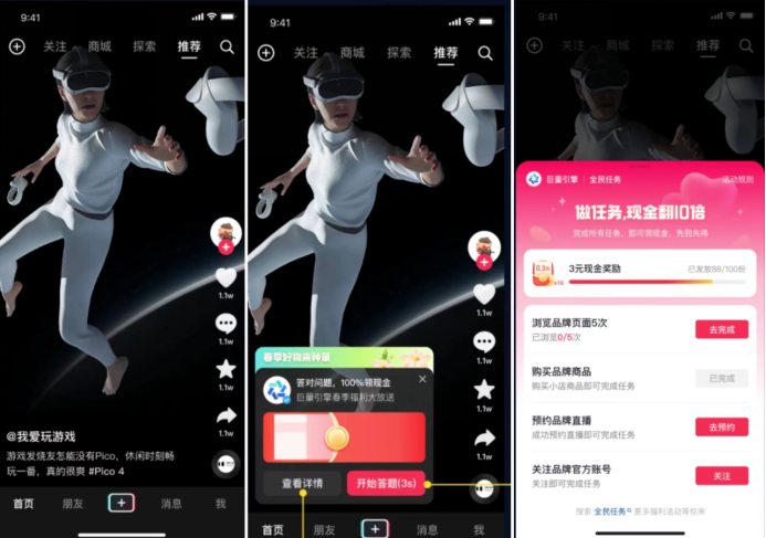 在產(chǎn)品價(jià)值的深度種草上,“答題種草”是一種新解法:在種草視頻講解過程中,前置答題/競(jìng)猜活動(dòng)利益點(diǎn),激發(fā)用戶互動(dòng);品牌設(shè)定的問題,可與種草素材深度綁定,突出產(chǎn)品賣點(diǎn)和價(jià)值;答題互動(dòng)后,用戶即有機(jī)會(huì)獲得激勵(lì),完成品牌額外定制任務(wù),讓現(xiàn)金獎(jiǎng)勵(lì)膨脹10倍。