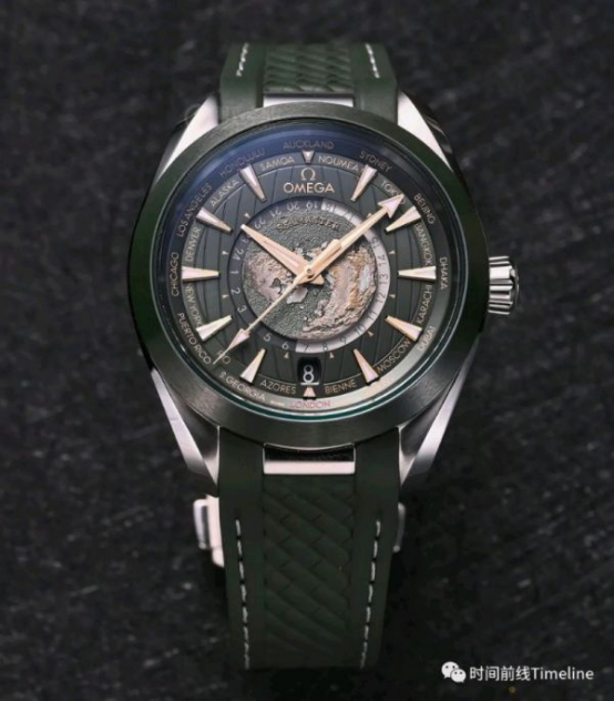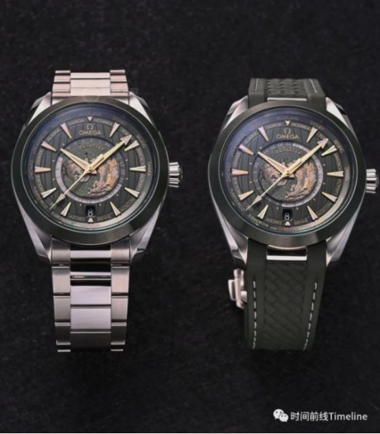 這款世界時的細節(jié)在于,內表盤的海洋顏色與手表配色一致,鈦殼是灰色、鋼殼是綠色;陸地則采用激光技術進行著色,金色是高海拔地區(qū)。其中鈦金屬表盤的黑灰色都是由激光歐米茄的地圖是以北極為中心的北半球,我們可以注意到,地圖帶有微微的弧形效果,模仿了真實的地球曲率。盤面上帶地圖的表不少,但像歐米茄做的這么細致真實的,極少。