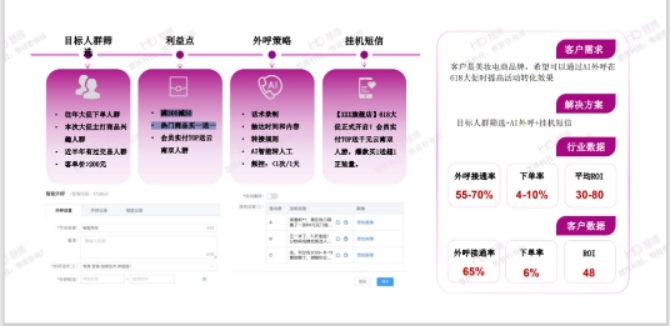 例如,今年618期間,慧博科技某美妝品牌客戶,基于慧博慧博云千載數(shù)據(jù)中臺監(jiān)測到最近上的新品下單的趨勢增強,基于該部分興趣人群的篩選,通過618這個大促契機,以“滿300減50 熱門商品買一送一”等利益點進行智能AI外呼觸達+掛機短信提醒,下單率提升6%。