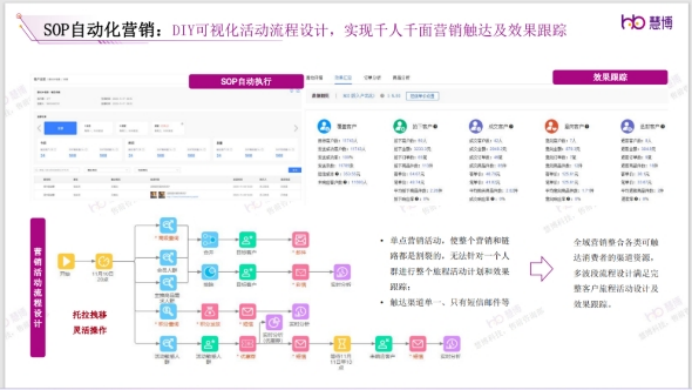 除了實現(xiàn)千人千面營銷觸達及效果跟蹤外,慧博云千載數(shù)據(jù)中臺還可以基于客戶分層,為不同標(biāo)簽的客戶制定不同的SOP,進行觸達和營銷,提升運營效率。