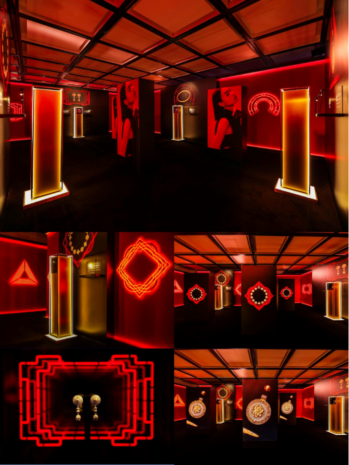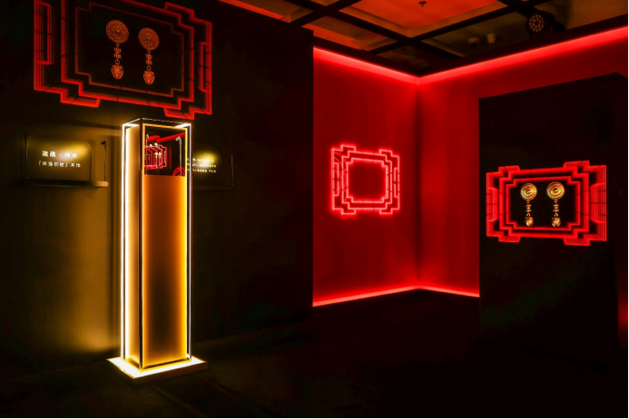 博大精深的中國傳統(tǒng)文化孕育出無限創(chuàng)造力和想象力,因此周大福珠寶集團在探索珠寶美學(xué)與中國傳統(tǒng)文化相結(jié)合的過程中不斷推陳出新,呈獻許多匠心獨運的藝術(shù)臻品——標志性的周大福傳承系列作品。此次GOLD IS CHIC鎏光時代·周大福傳承系列黃金美學(xué)藝術(shù)展跨越時空界限,將蘊含歷史、文化的黃金美學(xué)呈現(xiàn)到大眾視野中,全方面展現(xiàn)黃金珠寶設(shè)計背后的時尚創(chuàng)意靈感、精益求精的工藝和具有東方韻味的藝術(shù)美學(xué)理念。此次展覽的空間設(shè)計從周大福傳承系列視覺大片中汲取靈感,衍生出紅黑金三色、光影不斷變換、又極富想象力的三個空間,以創(chuàng)新的藝術(shù)視角展現(xiàn)品牌具有中國傳統(tǒng)文化內(nèi)涵的時尚潮流形象。置身于展覽空間,映入眼簾的是霓虹線條與迷離燈光相互交織而成的“時光隧道”,使人仿佛置身于過去與未來的交界地。光影流動的變幻間,映照出品牌歷經(jīng)歲月沉淀后的璀璨輝煌,這意味著品牌正開啟黃金世代的嶄新篇章。