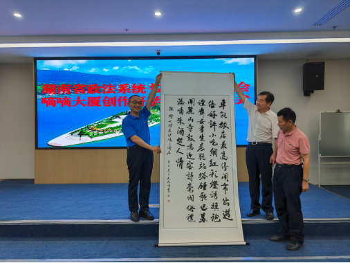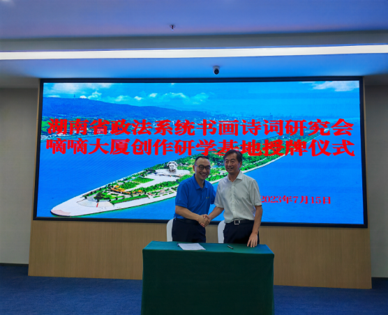 詩以言志,文以化人。以法護商,以商促文。7月15日上午,坐落于長沙市芙蓉區(qū)“中央文化區(qū)”的嘀嘀大廈五樓會議室高朋滿座,熱鬧非凡。“湖南省政法文化嘀嘀大廈創(chuàng)研基地”簽約暨掛牌儀式在此隆重舉行。省政法系統(tǒng)書畫詩詞研究會主席團成員彭對喜,副會長劉慶富;詩詞分會主席陳嶺及副主席賀曦、周加良、江世炎;書法分會主席陳祥松、副主席吳若順;長沙法官文聯(lián)副主席胡軍軍等領(lǐng)導(dǎo)和嘉賓出席活動。
