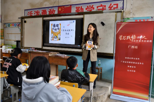 4月25日下午,“學(xué)思踐悟二十大 投教服務(wù)校園行”在浦北縣三合鎮(zhèn)橋頭小學(xué)開展。深交所、海通證券投教基地的專業(yè)人員深入各個班級進(jìn)行少兒財商授課,借助由深交所投資者服務(wù)部編著的《漫話大股市》,將專業(yè)的財經(jīng)內(nèi)容以通俗易懂的圖文形式傳授給小朋友們。“公司到底是什么?”“公司上市又是什么?”“有限責(zé)任公司與股份有限公司的區(qū)別在哪?”……一顆顆財商的種子在孩子們的心中生根發(fā)芽。