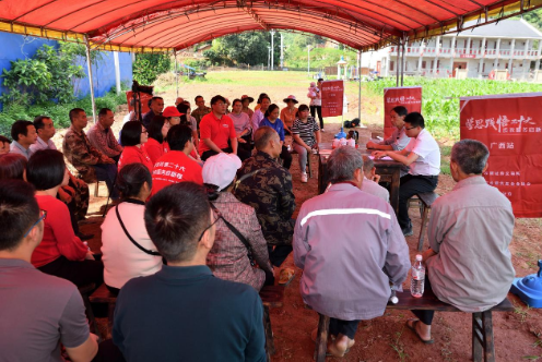 4月26日下午,活動一行人走進(jìn)了浦北縣柑子根村第一黨支部。在柑子根村中心一片碧綠的田野上,擺放著整齊的板凳桌椅,村民代表相圍而坐,共同學(xué)習(xí)了一堂別開生面的“田間黨課”。