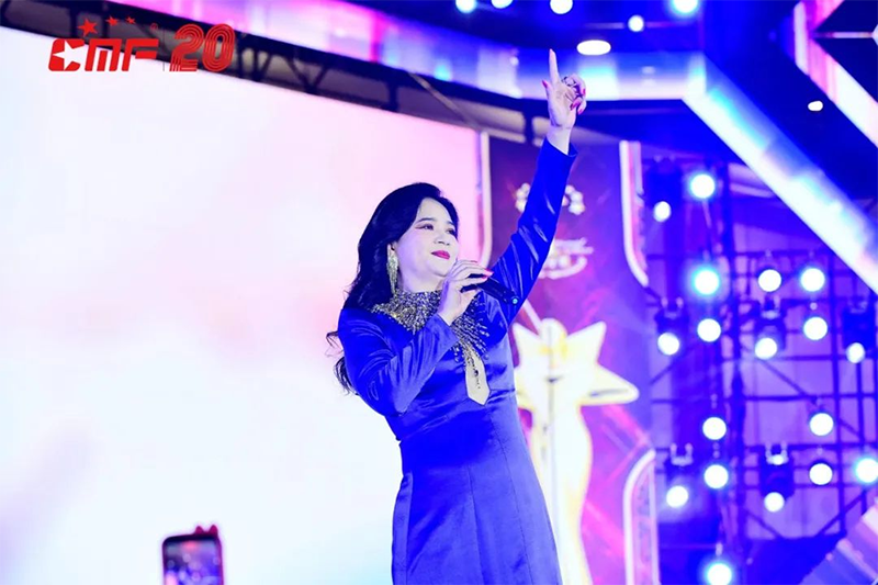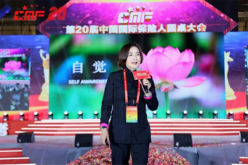 中國保險皇后劉朝霞兩度登臺演唱,盡展新時代最美保險人的風采,將晚會推向高潮。