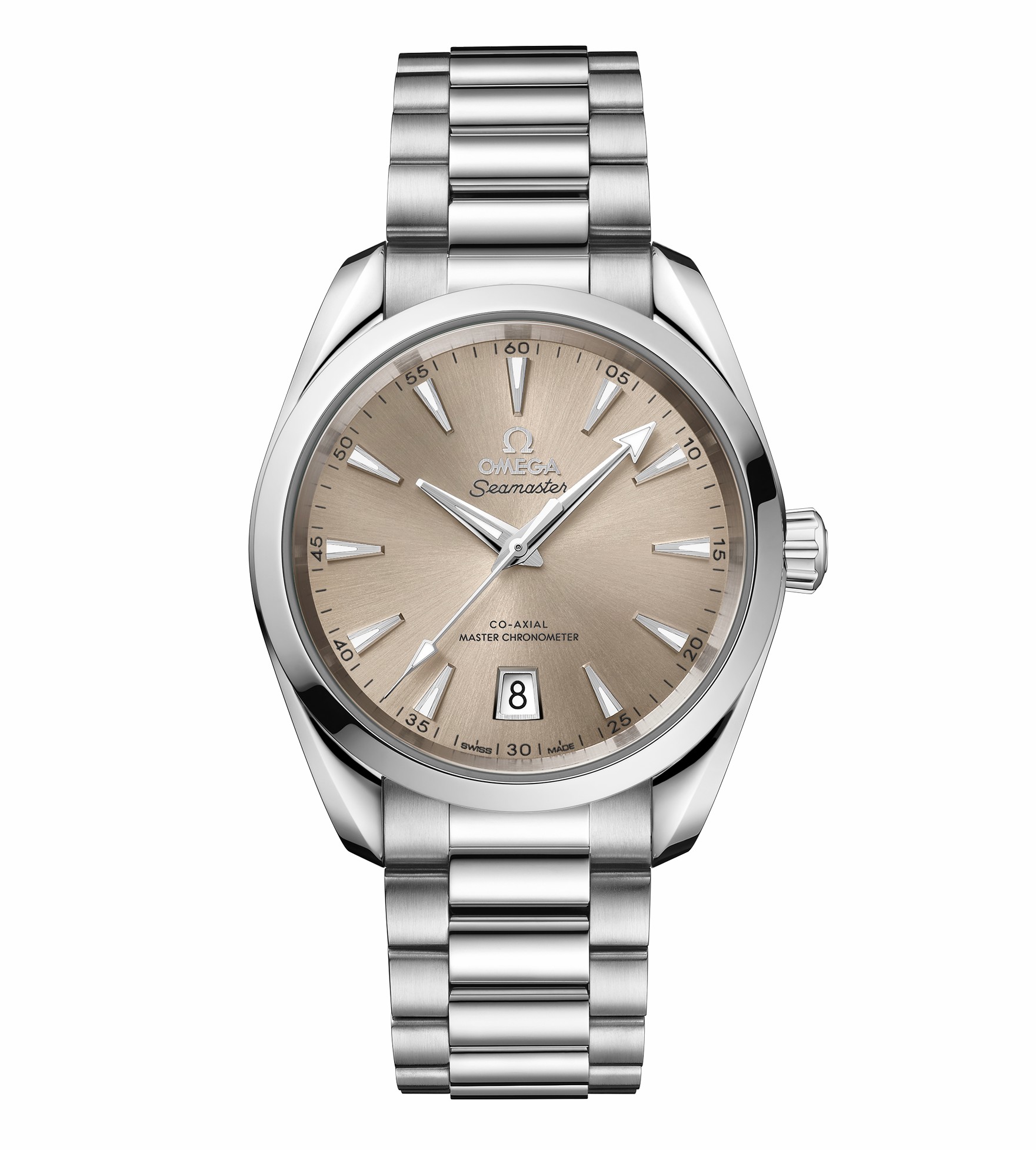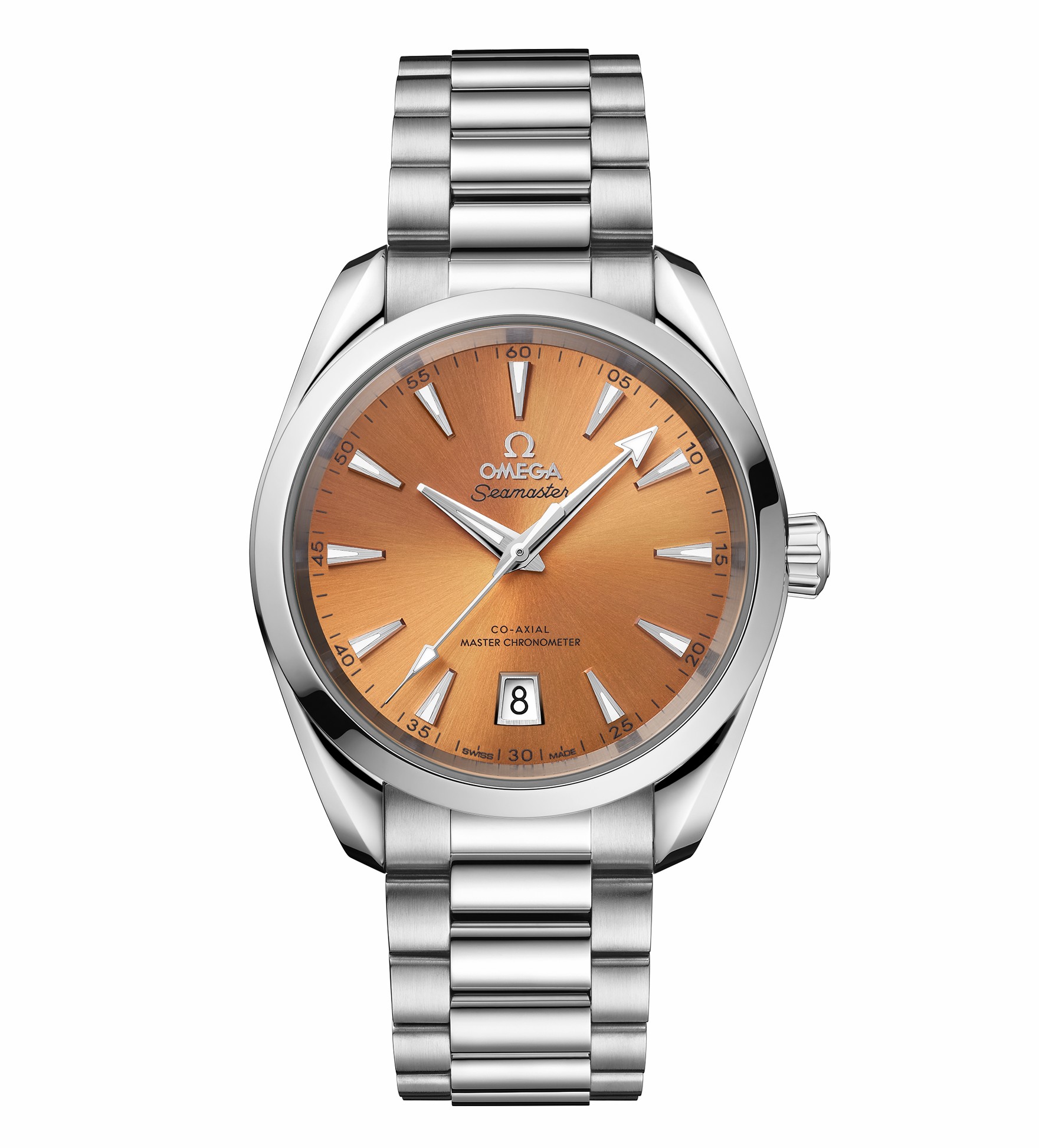 海馬系列 Aqua Terra 150米38毫米至臻天文臺表采用對稱設(shè)計,表殼和表冠均以拋光精鋼材質(zhì)打造,表背采用波紋邊緣設(shè)計。6點位設(shè)有日歷窗,鍍銠指針和小時刻度均覆有白色 Super-LumiNova 夜光涂層。不銹鋼表鏈采用精美的圓弧形鏈節(jié),經(jīng)拋光和拉絲處理。內(nèi)部搭載歐米茄8800至臻天文臺機芯,通過由瑞士聯(lián)邦計量研究院(METAS)核準的至臻天文臺認證,其精準度、防磁性和整體性能均達到行業(yè)的更高標準。其表盤由黃銅制成,經(jīng)過漆面處理,由中央向四周呈現(xiàn)出太陽射線的打磨效果。各種色彩中,橘黃色古典氣息十足,雅致而沉穩(wěn)。砂巖色樸實無華,屬于低調(diào)而休閑的實力派。