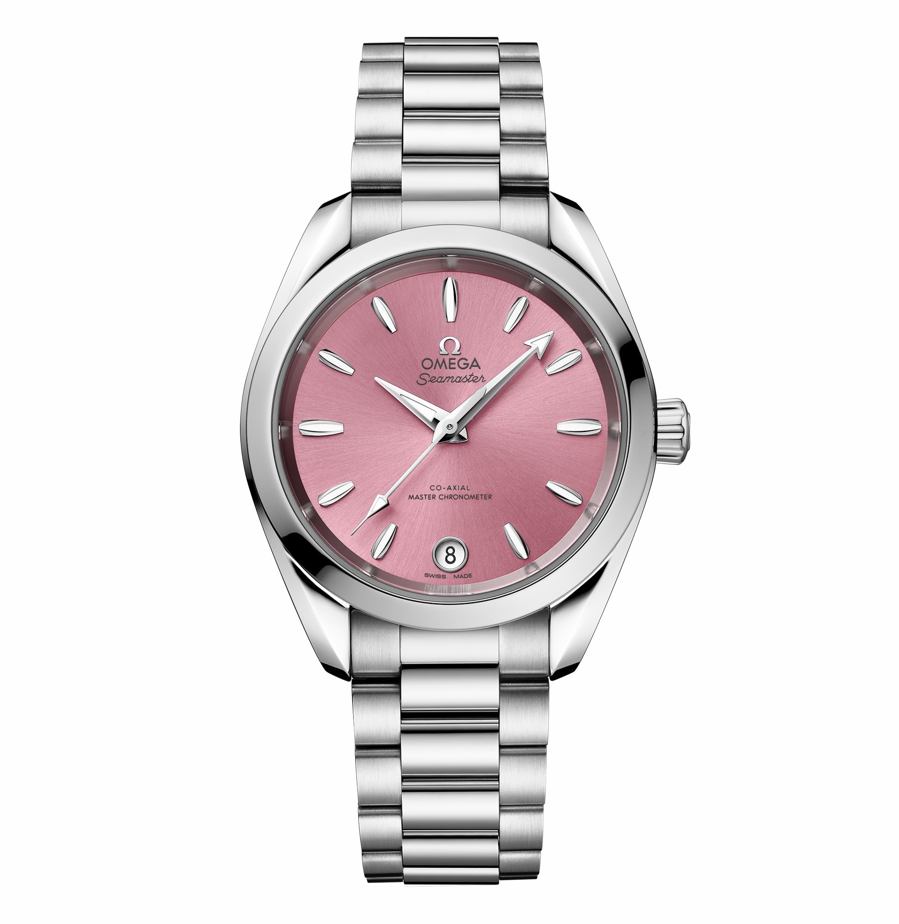 對于女性而言,Aqua Terra 150米34毫米至臻天文臺表或許會更加得心應手一點吧。其整體內(nèi)外的設(shè)計基本延續(xù)了36毫米款的特征,變化主要在于盤面的色彩,如貝殼粉色凸顯出其時尚的柔美,而海藍色表盤則有剛?cè)岵奈兜?#xff0c;兩者都帶有明顯的婉約色彩,可能頗投女性的眼緣吧。此外,其指針、小時刻度和歐米茄品牌標識均以拋光白色18K金制成,6點位的日歷窗由硬朗的梯形變成可愛的圓形,無疑強化了其女表的色彩。