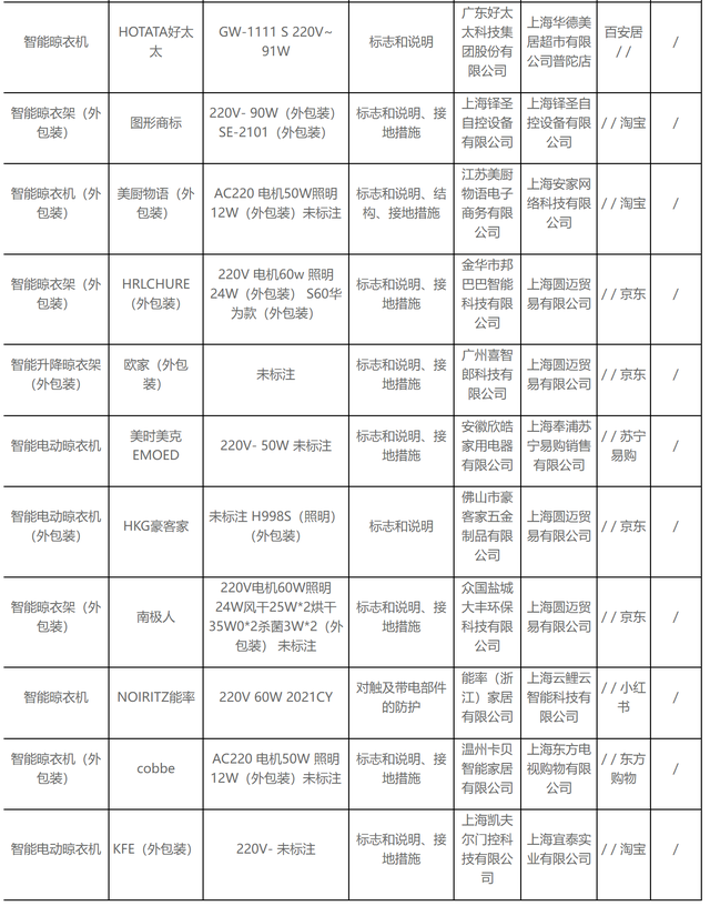 無獨有偶,據(jù)上海市市場監(jiān)督管理局發(fā)布的2022年上海市產(chǎn)品質量監(jiān)督抽查結果(第十批)顯示,11批次智能晾衣架抽查不合格,其中涉及HOTATA好太太、美時美克EMOED、南極人等品牌。
