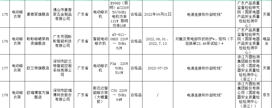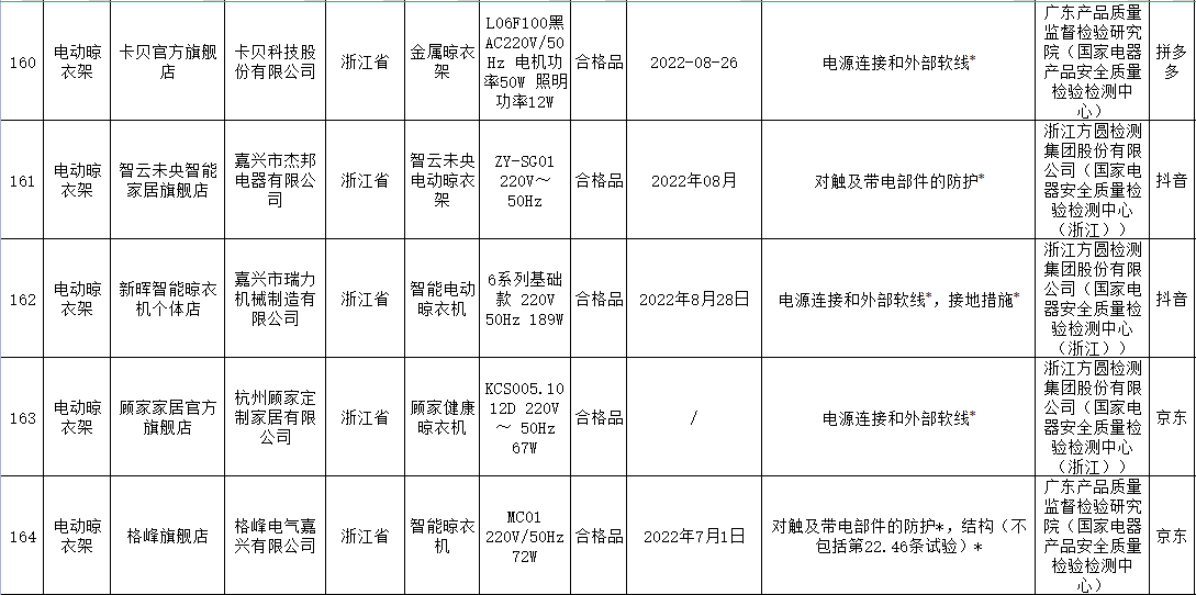 本次電動晾衣架抽查檢驗9個省(市)48家企業(yè)生產(chǎn)的52批次產(chǎn)品,包括天貓、京東、拼多多、抖音等電子商務平臺,發(fā)現(xiàn)24批次產(chǎn)品不合格,涉及卡瑞琪(courage)、顧家、格峰、盼盼、歐蘭特等品牌。